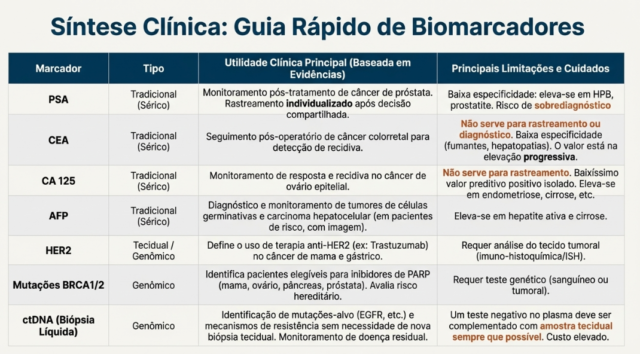 Em pacientes com doença avançada, sintomas, funcionalidade e qualidade de vida frequentemente são melhores preditores de desfecho do que alterações isoladas de marcadores séricos. Biomarcadores emergentes, como o ctDNA, são promissores, mas ainda devem ser considerados complementares, e não substitutivos.